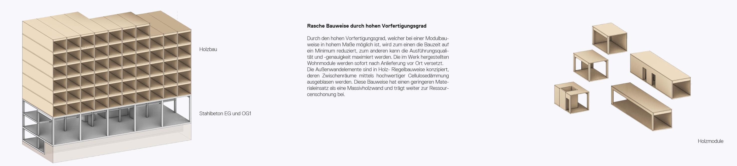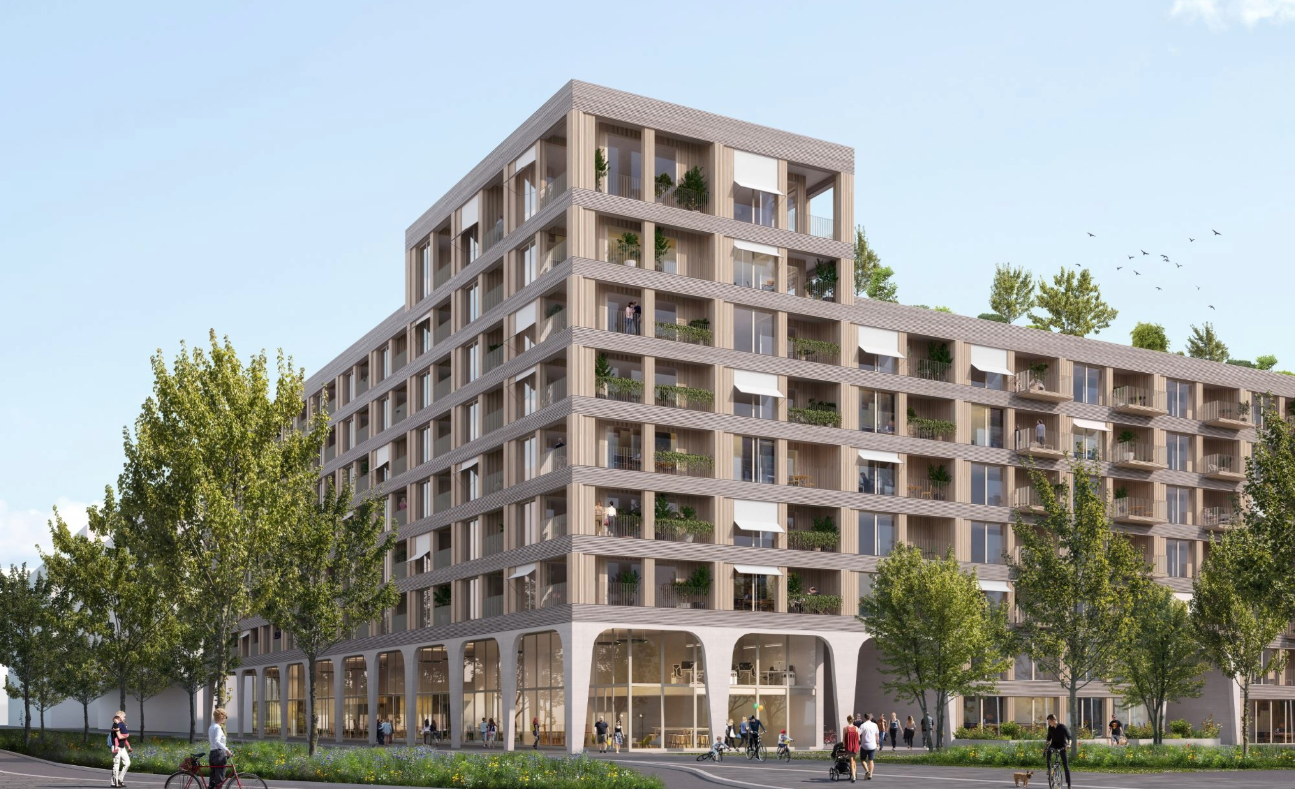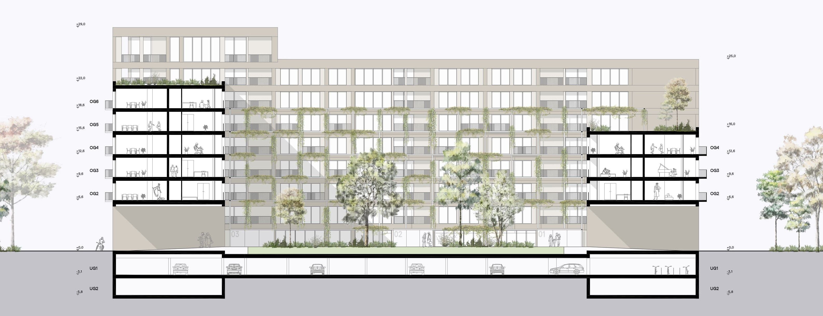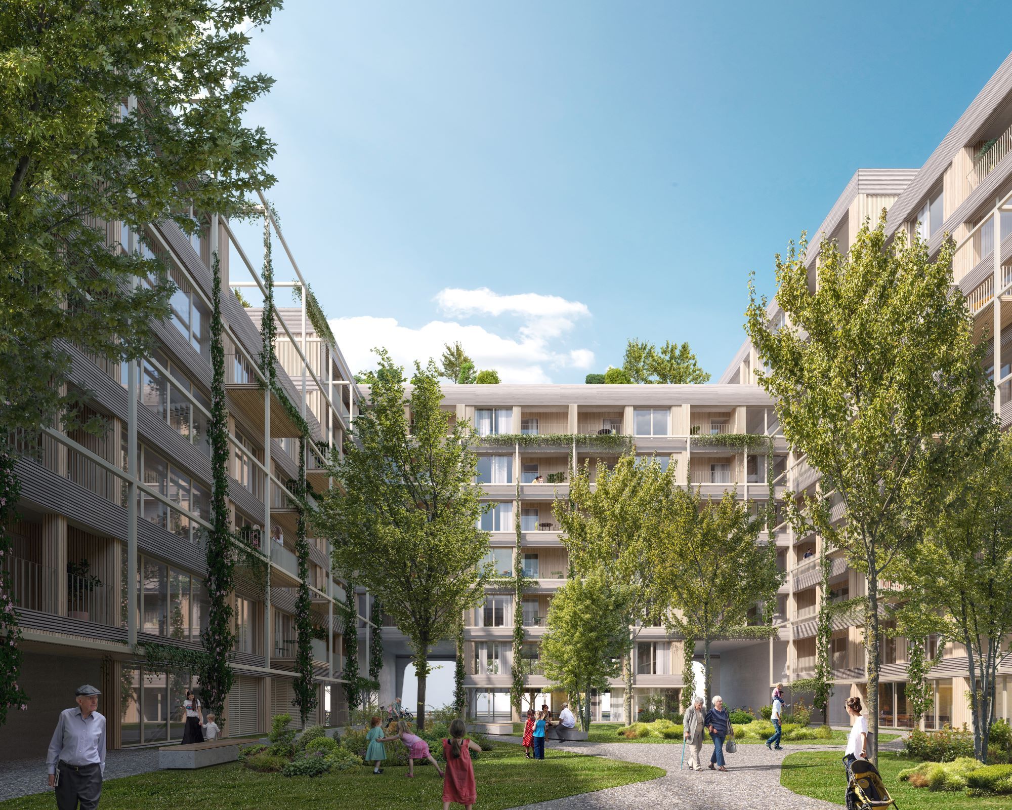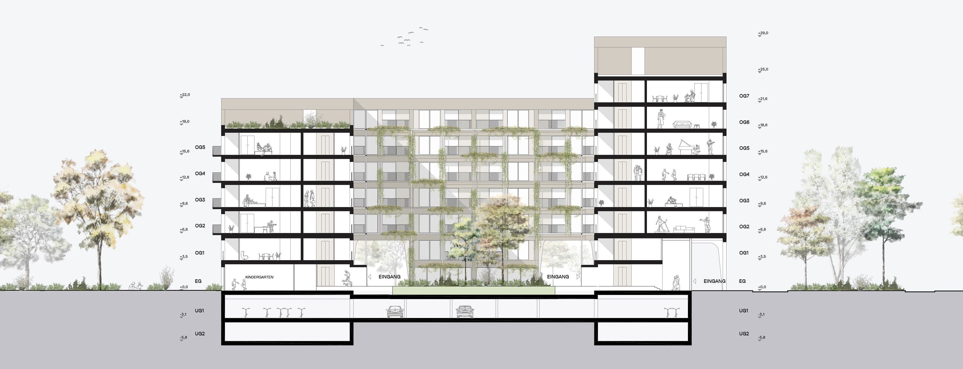 All upper floors above the ceiling of the first storey are constructed using modular timber construction. The high proportion of timber results in an excellent CO₂ balance. The courtyard functions as a shaded oasis. Plant islands with small mounds for tree planting (thornless honey locust, winter cherry) help structure the space. A network of paths, along with play and leisure areas, invites residents to linger in the shade of the trees. Surfaces are permeable and open-pored, directing rainwater into the “sponge” system above the underground garage.