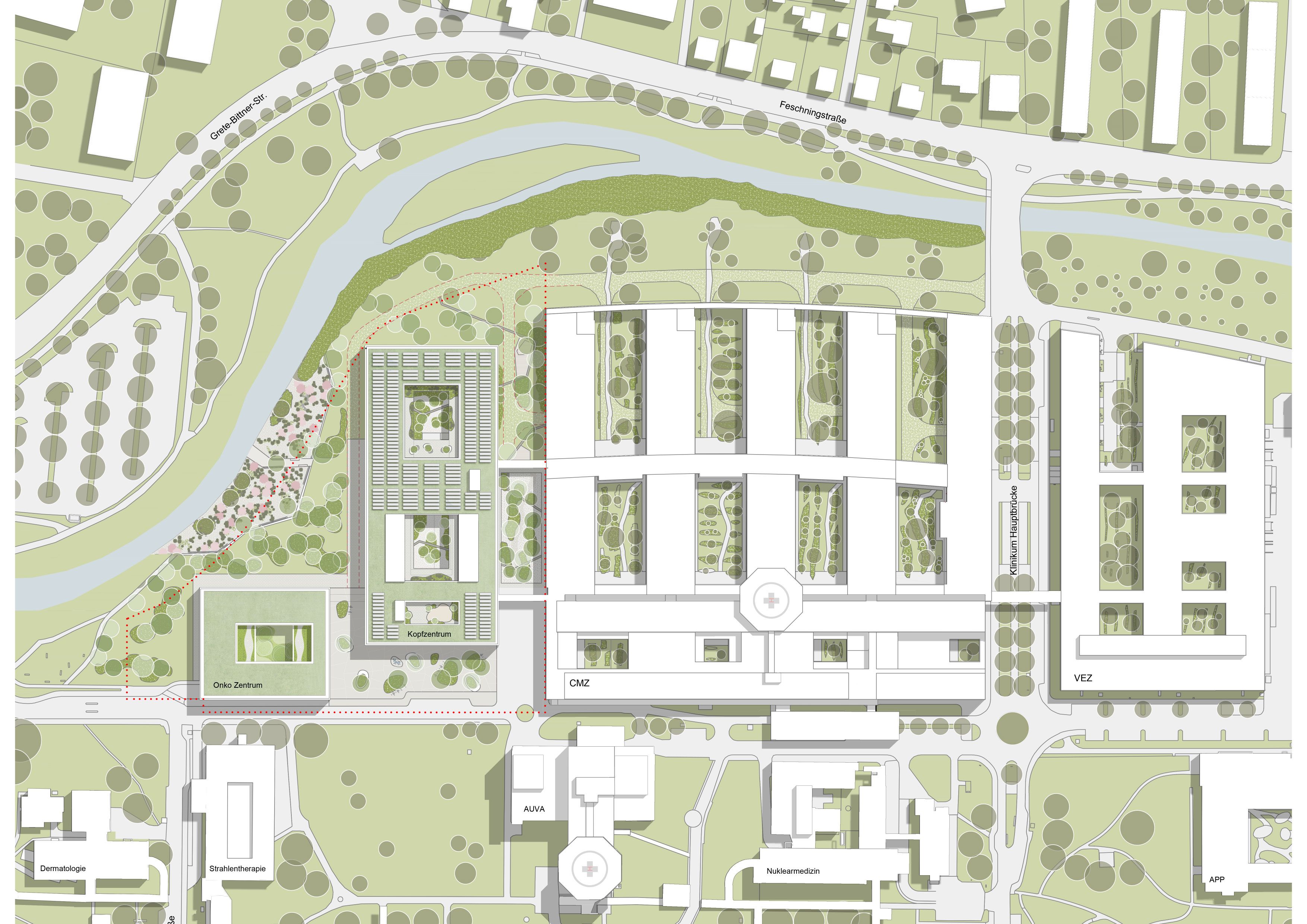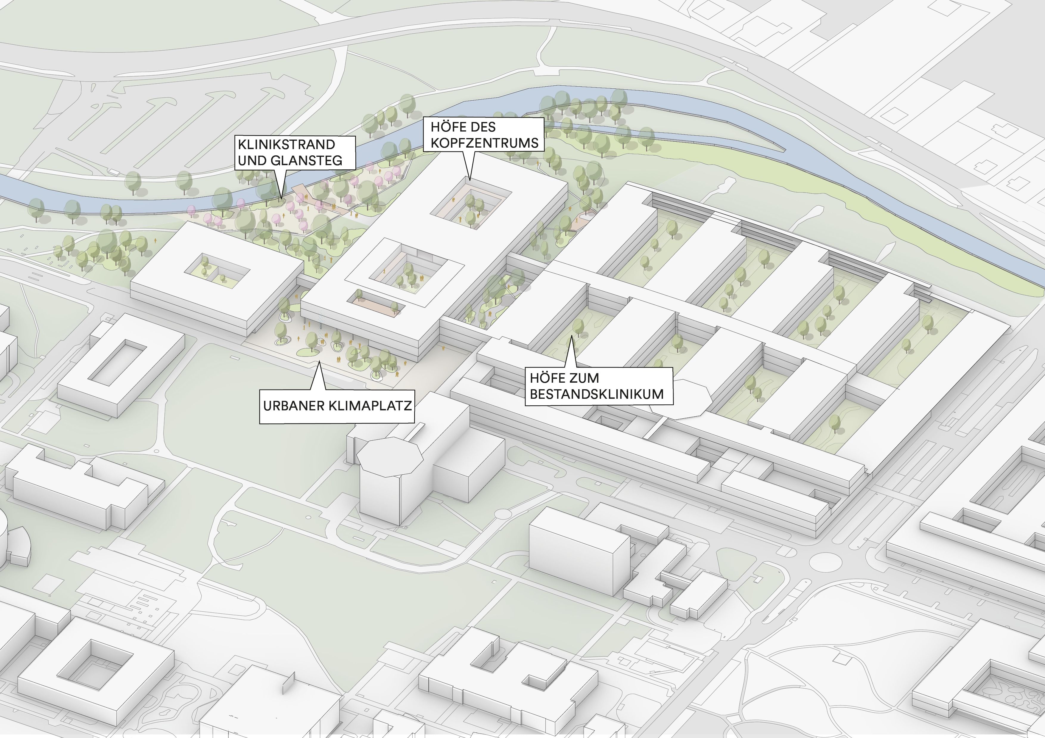 Der quaderförmige Neubau mit zwei großzügigen Innenhöfen gleicht sich in Höhe und Kubatur an das CMZ an. Der rhythmische Charakter der Höfe des Klinikums bleibt damit erhalten, ebenso der städtebauliche Maßstab. Zur Schaffung eines attraktiven öffentlichen Raums, rückt das neue Kopfzentrum vom südlichen Rand des Baufelds etwas zurück.