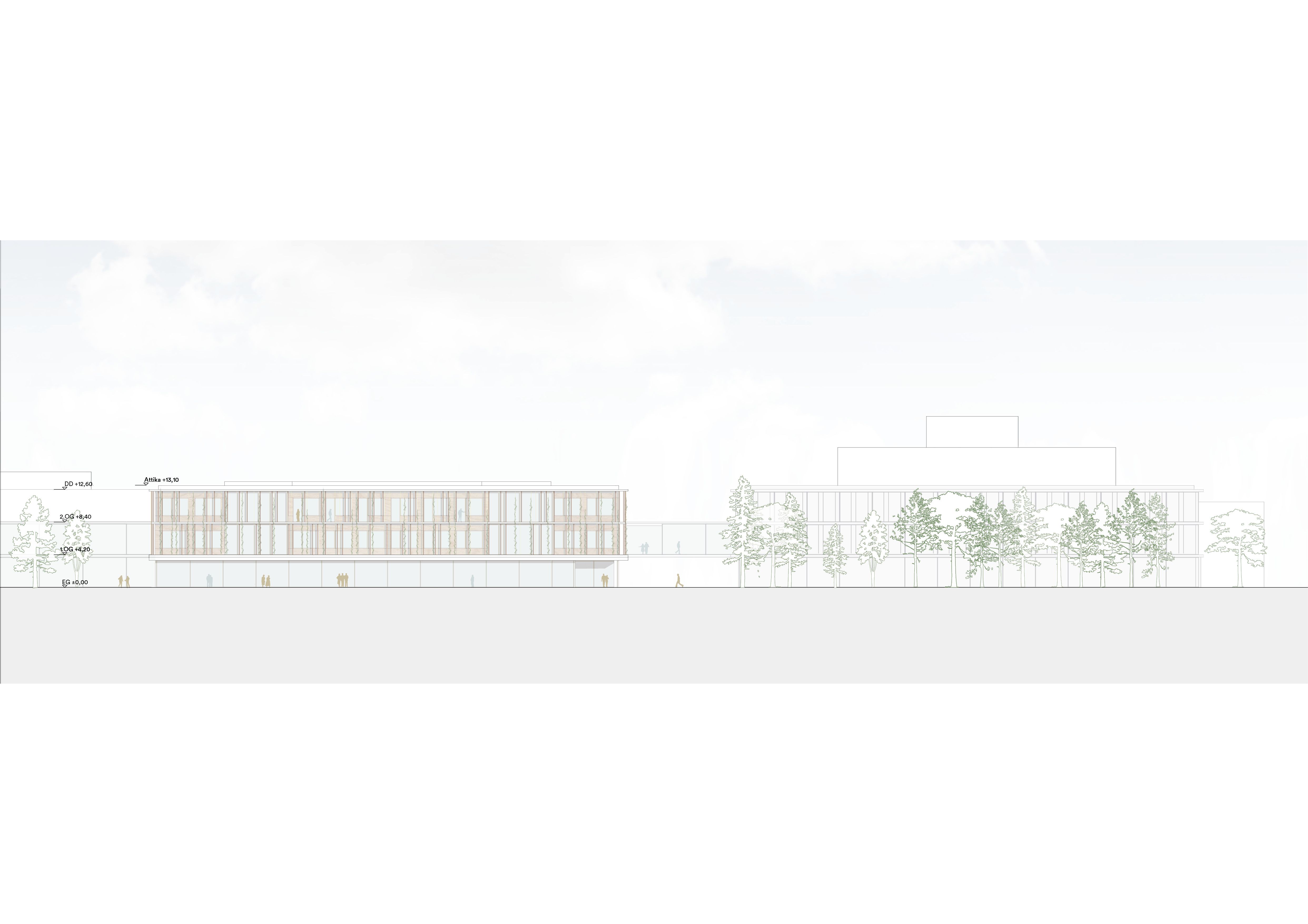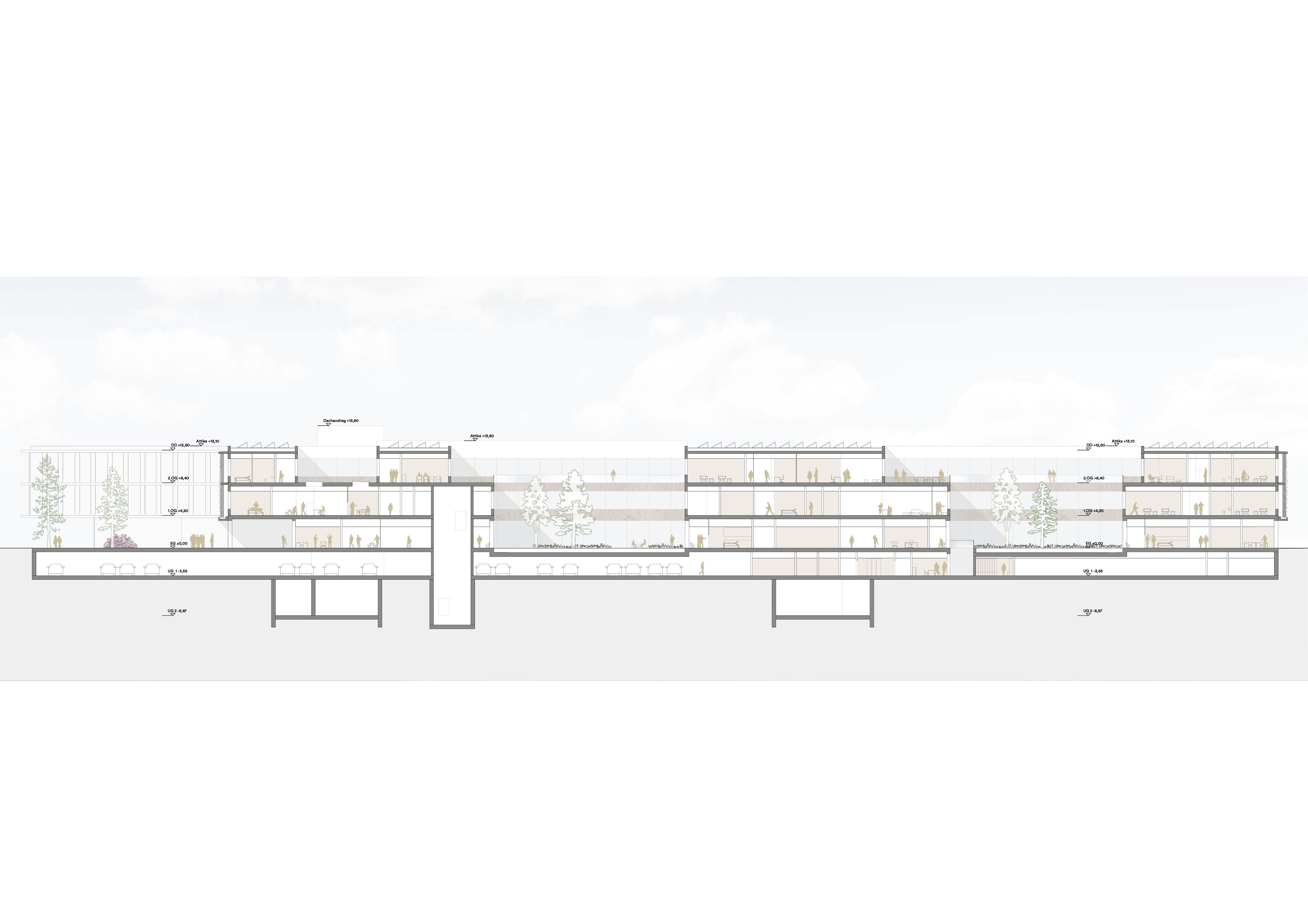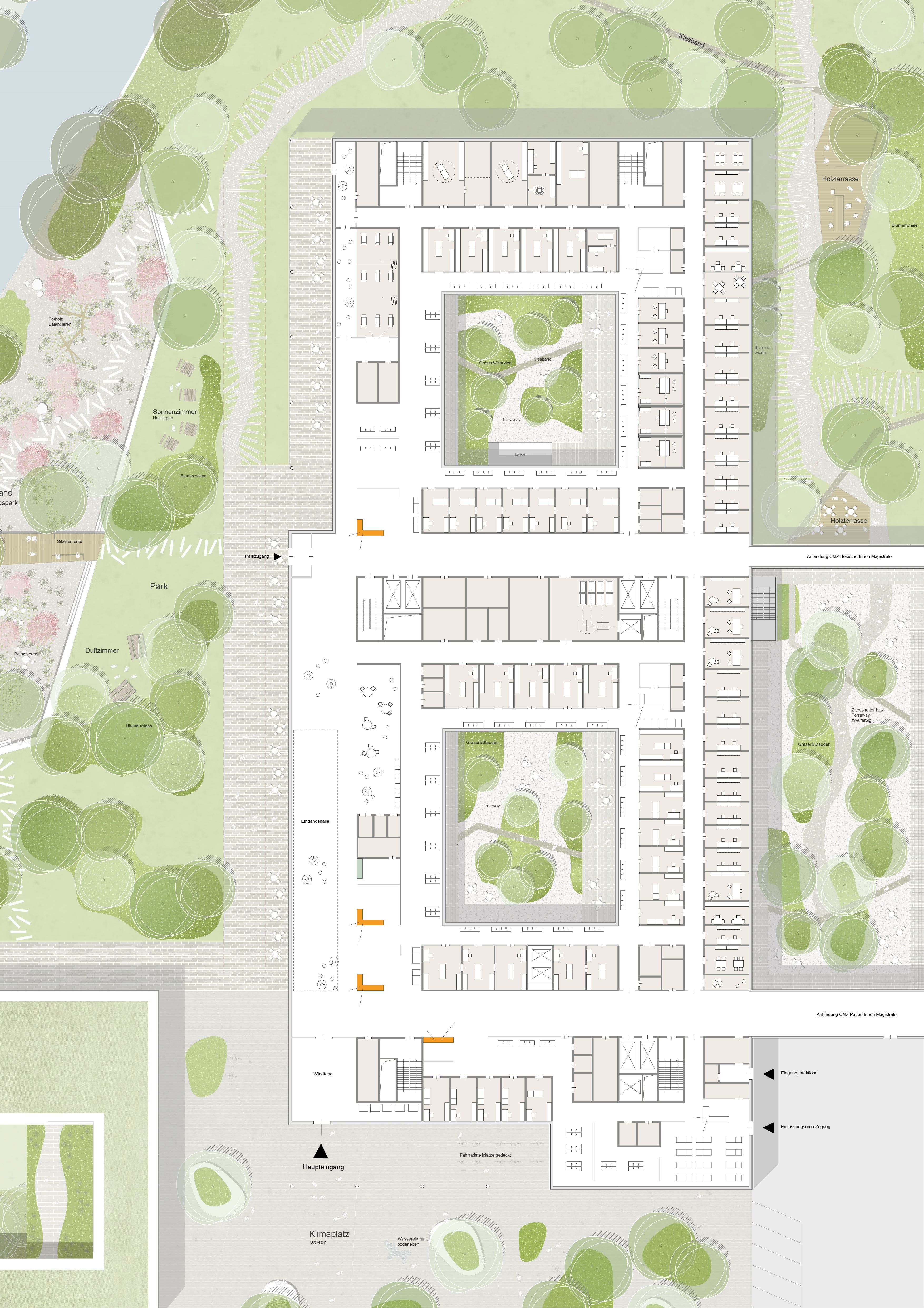 Der Freiraumentwurf schafft abwechslungsreiche räumliche Sequenzen. Die großzügig durchgrünten Höfe lassen viel Tageslicht in alle Aufenthaltsräume, dienen der Erholung und der Verbesserung des Mikroklimas, und machen gemeinsam mit der begrünten Dachterrasse am ersten Obergeschoss die Natur auch im Inneren des Neubaus deutlich erlebbar.