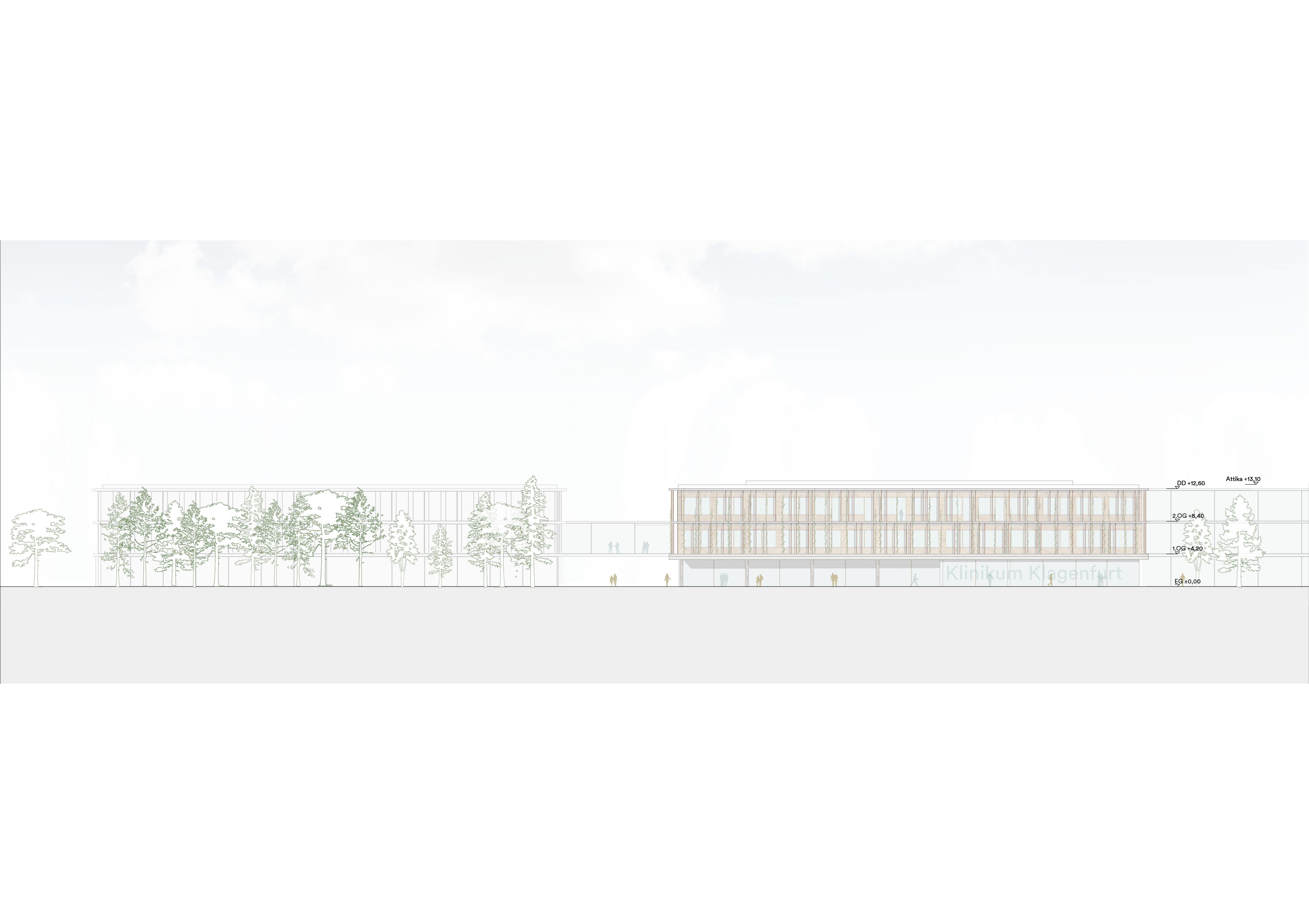 Im Erdgeschoss des neuen Kopfzentrums sind die Ambulanzen für die Augen-, MKG- und HNO-Heilkunde angeordnet. Im ersten Obergeschoss liegen Tagesklinik, OP-Zentrum und Therapiebereiche mit direkter Verbindung zum CMZ. Im zweiten Obergeschoss befinden sich die Pflegestationen sowie, ein Outdoor-Fitnessbereich für das Personal. Die neue Erweiterung ist klug durchdacht und fügt sich selbstsicher an den Bestand des Klinikums Klagenfurt.