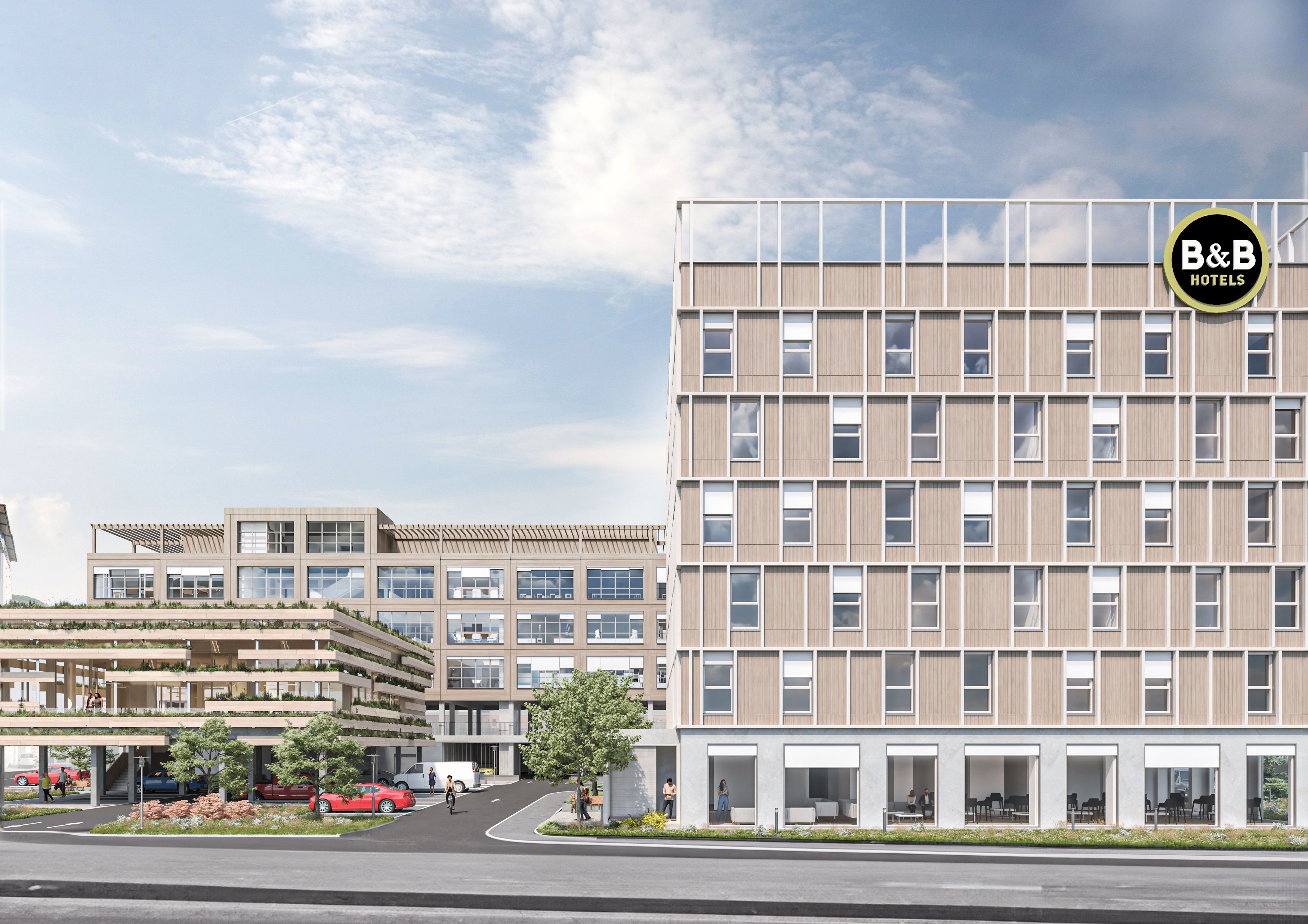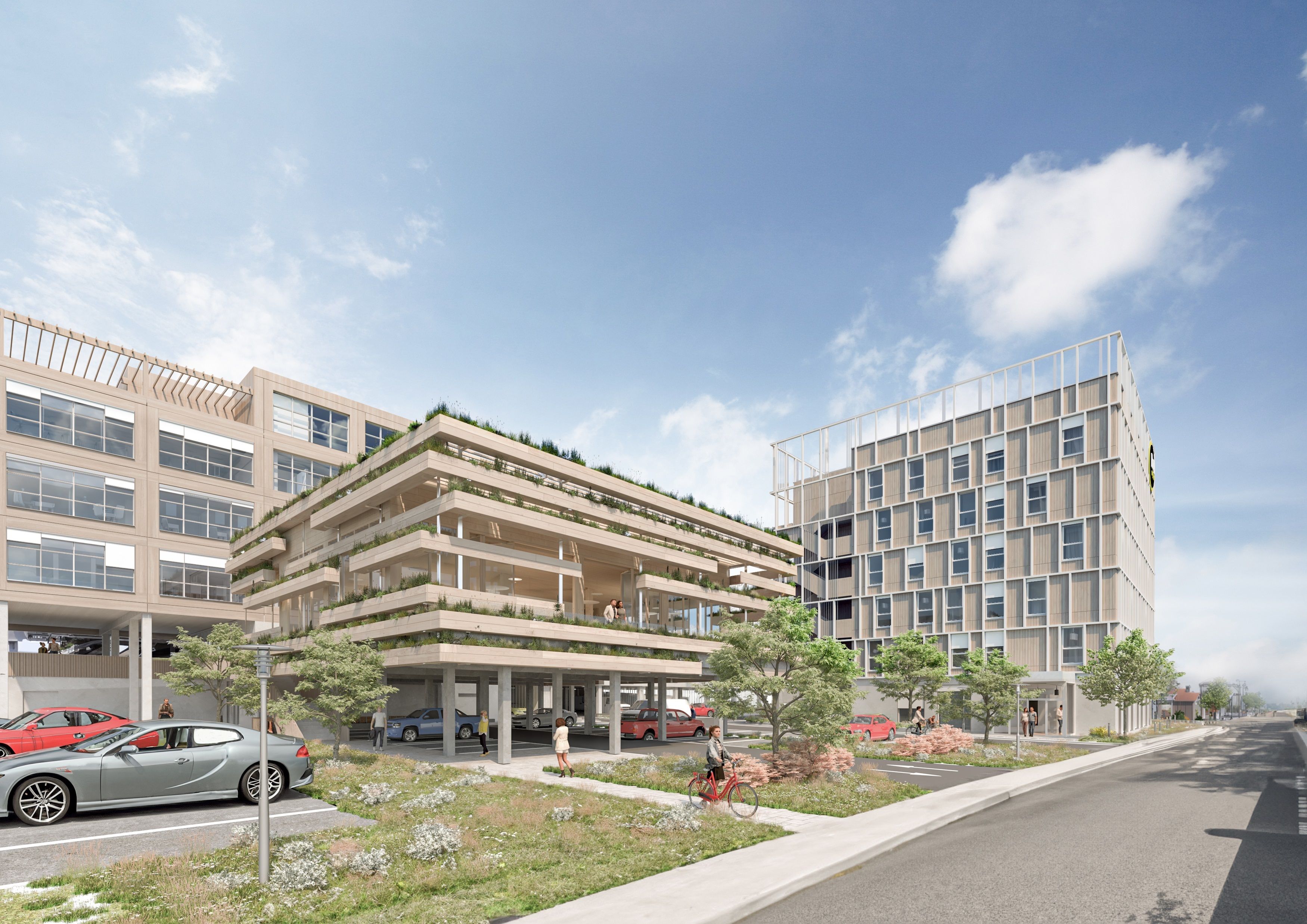 Eine klimagerechte Bauweise soll durch den teilweisen Holzbau, Maßnahmen gegen Überwärmung, den Einsatz von begrünten Dächern, Fassaden, Erdwärme-Sonden und PV-Anlage gewährleistet werden