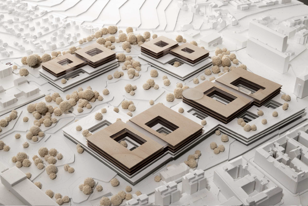 Die städtebauliche Grundidee ist, den Übergang von der konsolidierten Stadt hin zur kleinteiligen Bebauung im Westen zu ordnen, eine klare Adresse zu bilden und das Areal leicht lesbar und erlebbar zu machen. Der Sockel des Zentralklinikums nimmt daher die Richtung und Traufhöhe der gründerzeitlichen Blockrandbebauung auf. Auf diesem Sockel ruhen zwei dreistöckige Doppelbaukörper, die so angeordnet sind, dass ein respektvoller Abstand zum Bestand entsteht.